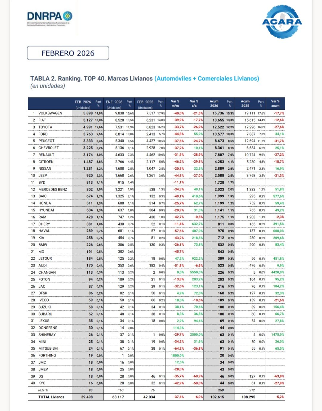 La Asociación de Concesionarios de Automotores de la República Argentina (ACARA) informa que el número de vehículos patentados durante febrero de 2026 ascendió a 42.026 unidades, lo que representa una baja del 5,7% interanual, ya que en febrero de 2025 se habían registrado 44.566 unidades. Si la comparación es contra enero, se observa una baja del 36,8% ya que en el pasado mes se habían registrado 66.454 unidades.