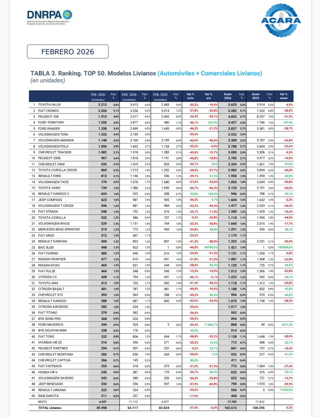 ACARA volvió a difundir cifras de patentamientos: Volkswagen fue la marca más vendida en febrero y la Hilux lideró el top ten por modelos