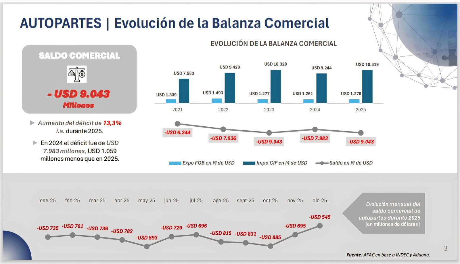 El comercio exterior de autopartes en 2025 registró un déficit comercial de USD 9.043 millones, lo que representa un incremento del 13,3% interanual respecto a 2024 (déficit de USD 7.983 millones); lo que lleva a un deterioro adicional de USD 1.059 millones.