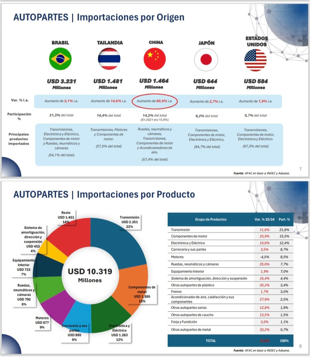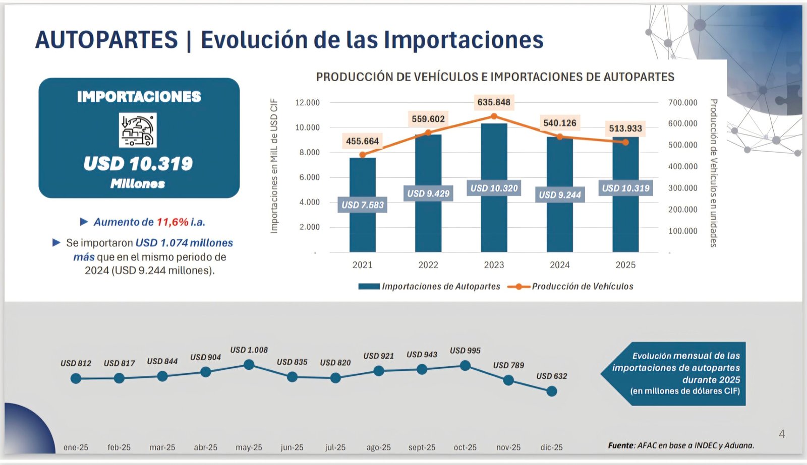 «No obstante, en 2025 se observó una suba de las importaciones a pesar de una disminución del 4,9% en la producción de vehículos, marcando una excepción a esta tendencia. Este resultado disruptivo se explica tanto por un aumento de las importaciones de autopartes debido a la fuerte entrada de bienes provenientes de Asia destinados al mercado de reposición, como así también de piezas para nuevos proyectos con bajo nivel de integración local», agrega el documento.