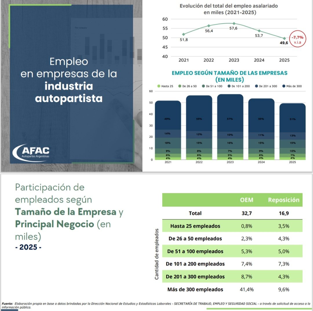 Casi la mitad del empleo se concentra en pymes de menos de 300 empleados, correspondiendo así el 21% a empresas de menos de 100 empleados. Las perspectivas para 2026, con una proyección de una nueva caída en la producción de vehículos del 7,5% y una consolidación de la suba de importaciones asiáticas de autopartes, no permiten ser optimistas con respecto al empleo sectorial durante este año.