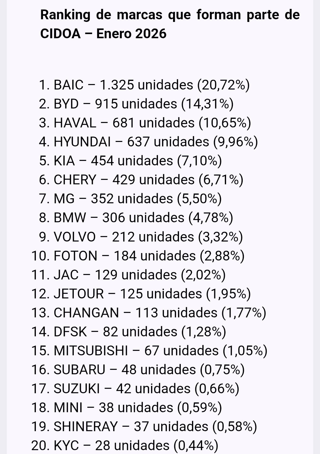 El ranking de patentamientos de enero 2026 lo encabeza BAIC con 1.325 unidades (20,72%), seguida por BYD con 915 unidades (14,31%), HAVAL con 681 unidades (10,65%) y HYUNDAI con 637 unidades (9,96%)1.