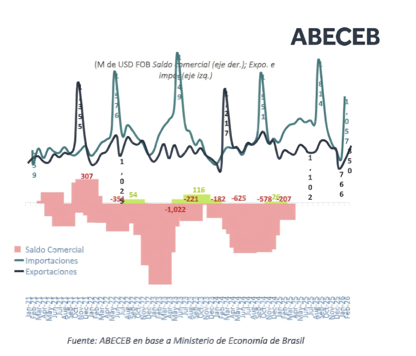 El flujo total de comercio se contrajo un 23,5%, alcanzando USD 1.907 millones, y el déficit acumulado en el primer bimestre fue de USD 356 millones, casi la mitad del registrado en 20241.