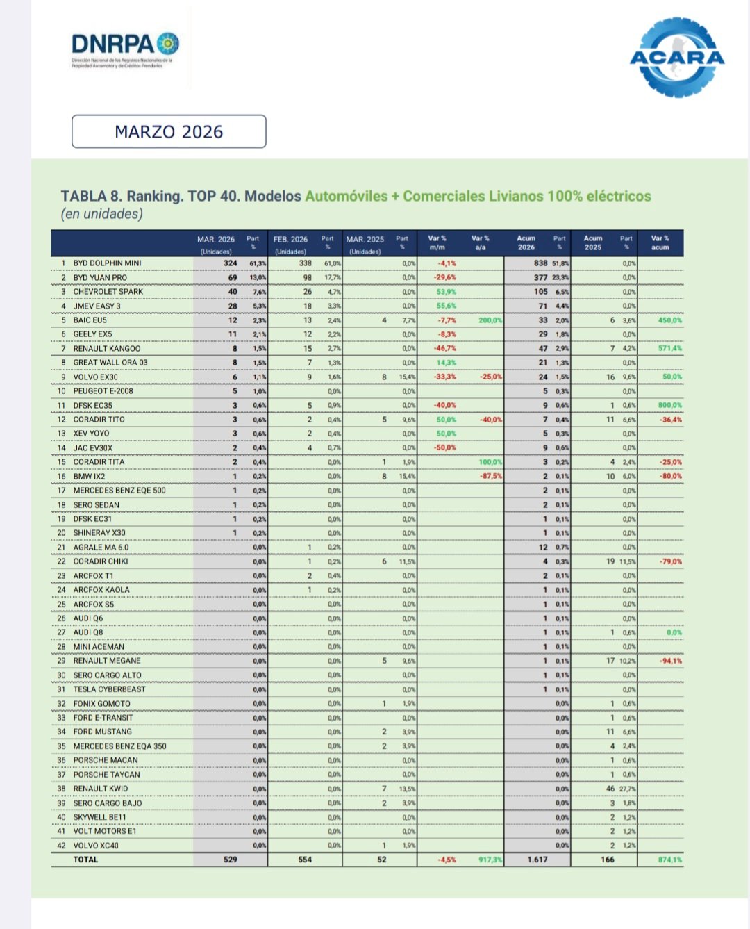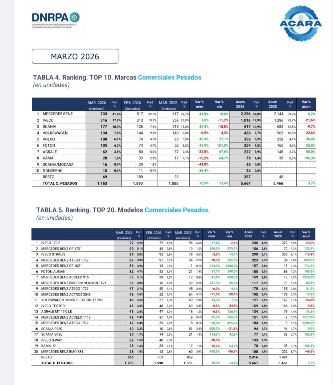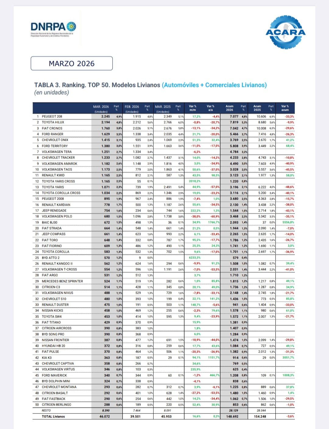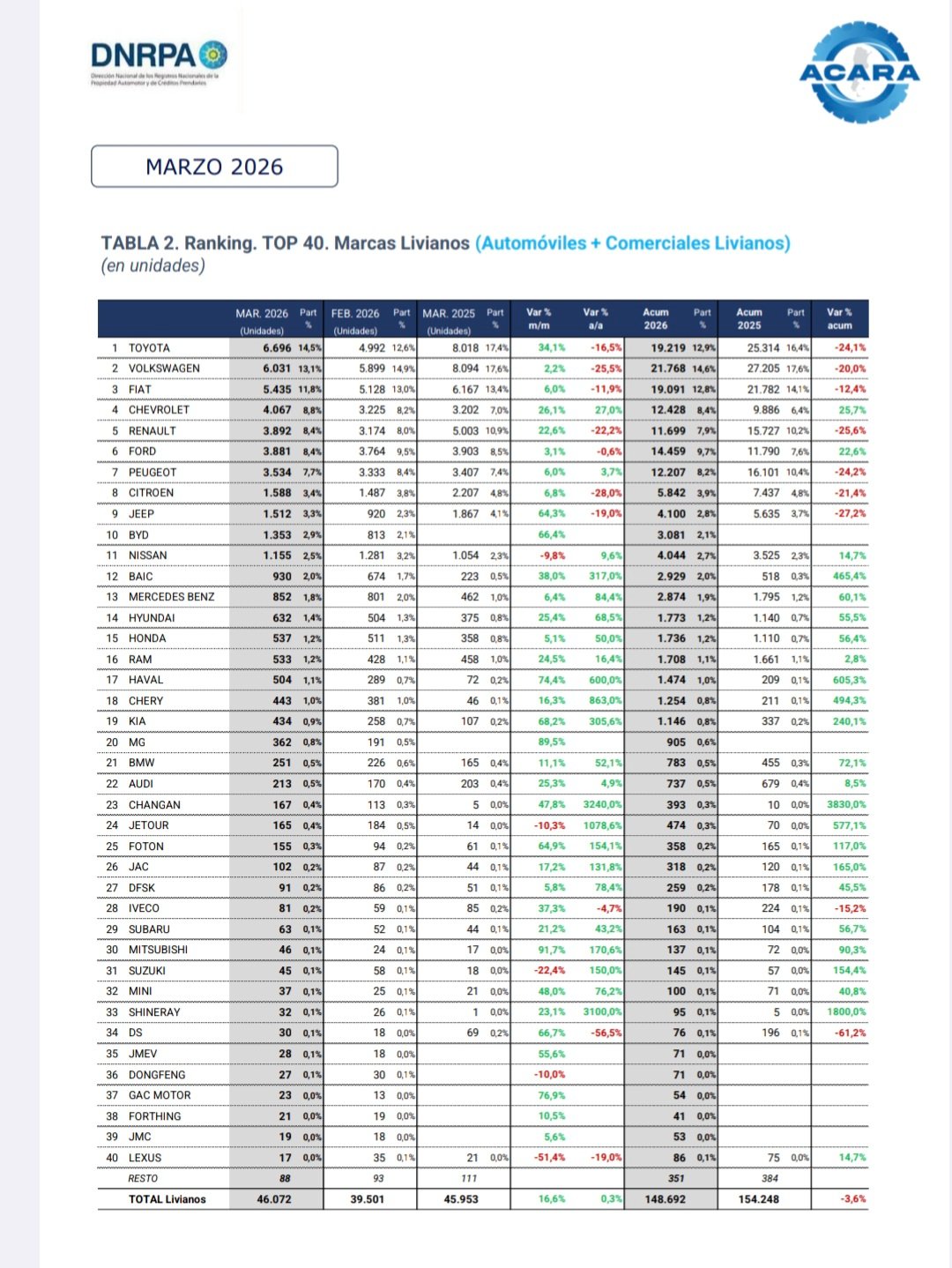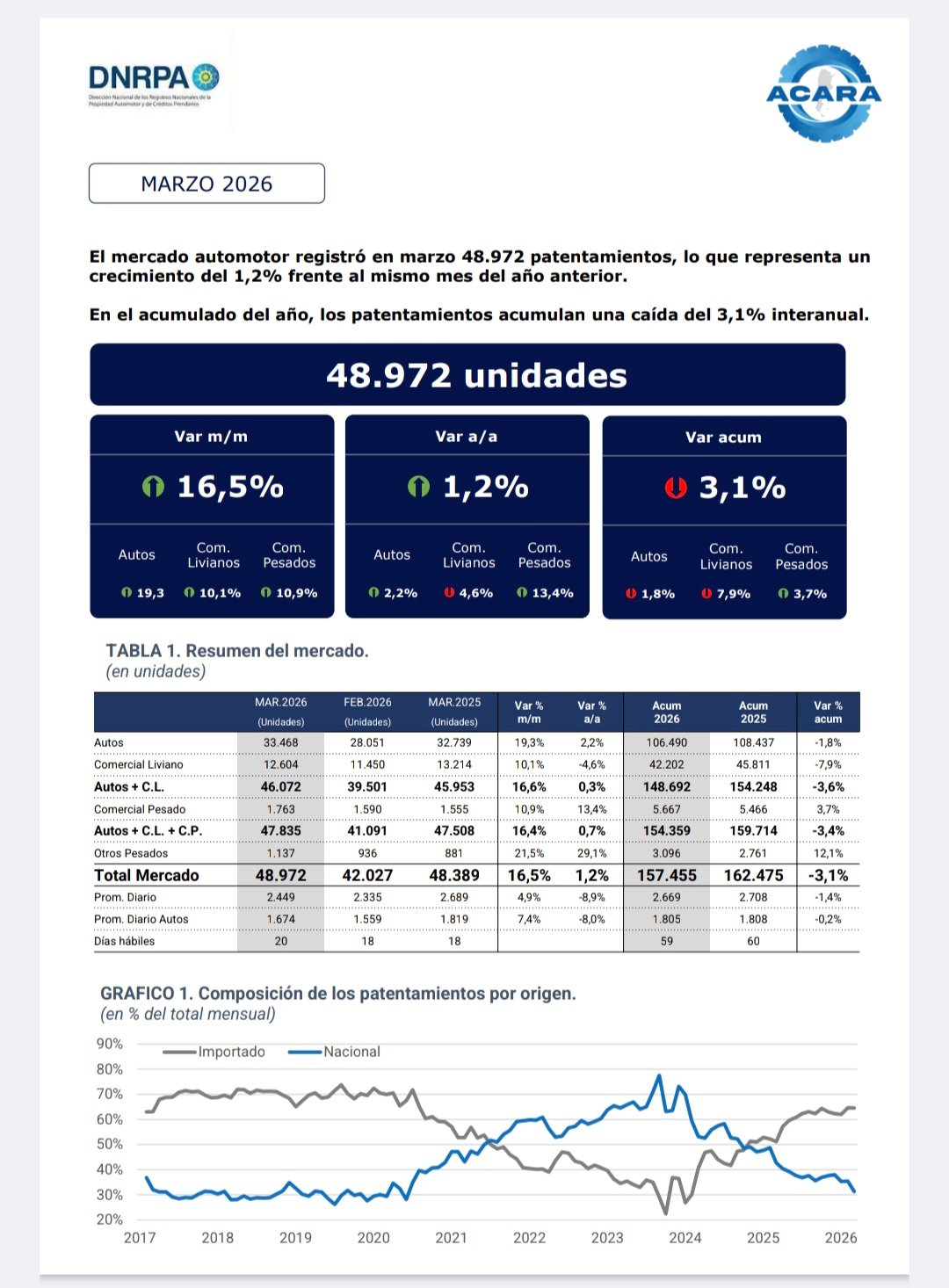 La Asociación de Concesionarios de Automotores de la República Argentina (ACARA) informa que el número de vehículos patentad os durante marzo de 2026 ascendió a 48.972 unidades, lo que representa un crecimiento del 1,2% interanual, ya que en marzo de 2025 se habían registrado 48.389 unidades.