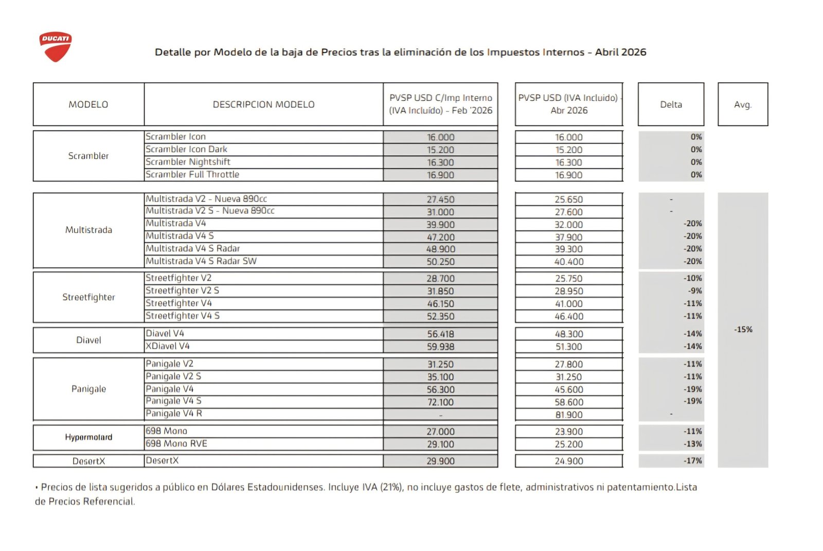 A continuación, se publica un cuadro comparativo de precios anteriores y actuales para las motos Ducati: