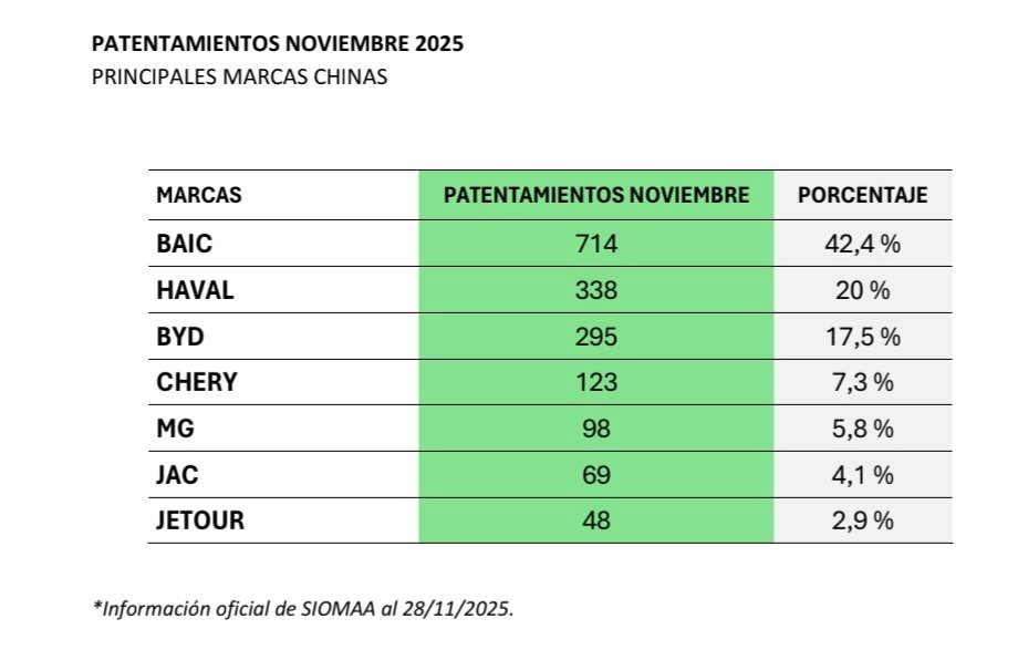 Entre todas las automotrices chinas, en noviembre, patentaron unas 1.800 unidades. El mercado del mes pasado fue de 34.900 0km, aunque esta cantidad incluye el segmento de vehículos pesados, donde no participan estas marcas chinas.