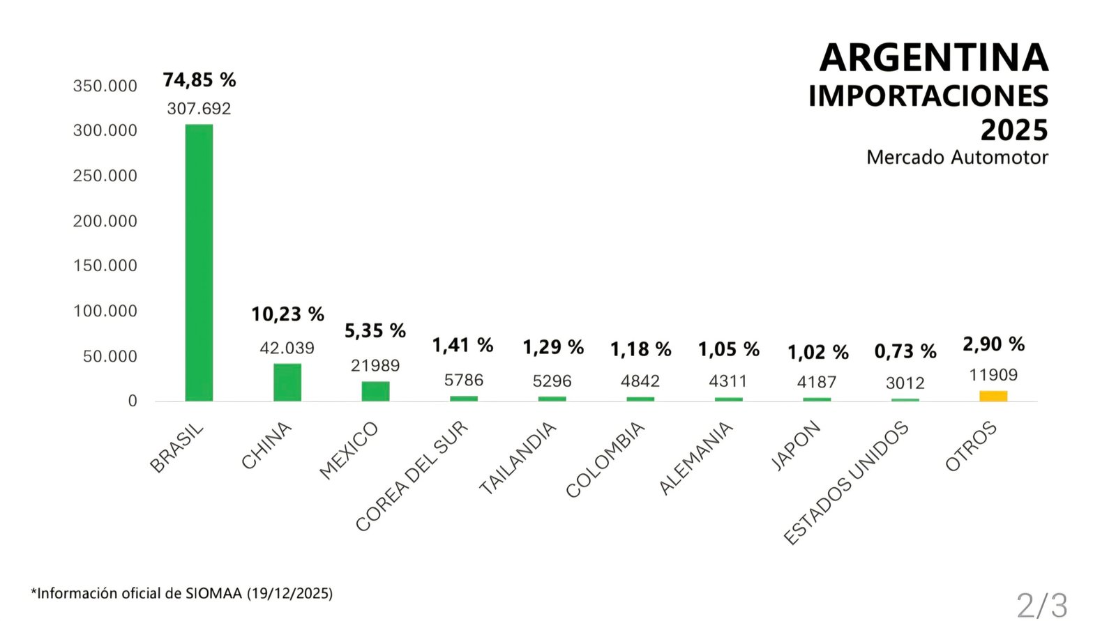 De ese volumen (poco va a cambiar con los patentamientos de diciembre), el 49% son brasileños. Esto equivale a 287.630 unidades.