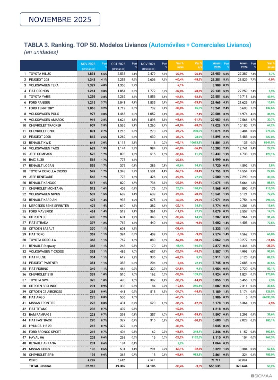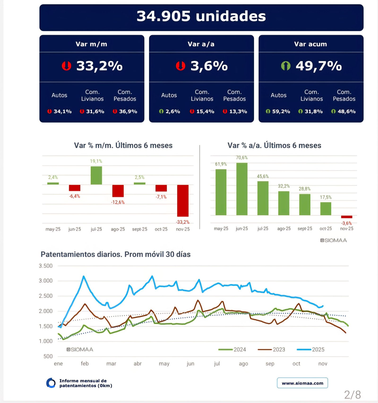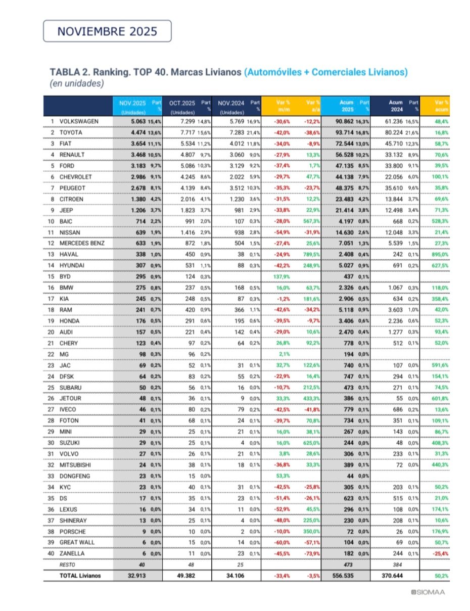 La entidad informó que el número de vehículos patentados durante noviembre de 2025 ascendió a 34.905 unidades, lo que representa una baja del 3,6% interanual, ya que en noviembre de 2024 se habían registrado 36.220 unidades. Si la comparación es contra octubre se observa una baja del 33,2% ya que en ese pasado mes se habían registrado 52.259 unidades. De esta forma, en los once meses acumulados del año se patentaron 587.666 unidades, esto es un 49,7% más que en el mismo período de 2024, en el que se habían registrado 392.450 vehículos.