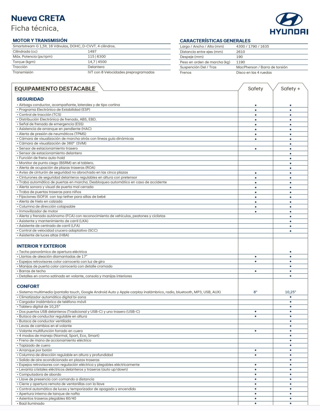 La Creta Safety comparte con la Creta Safety + —la versión actualmente comercializada— el diseño global de la nueva generación, la plataforma, la motorización Smartstream G 1.5 D-CVVT de 115 CV y 14,7 kgm de torque, y el eficiente conjunto mecánico asociado a la transmisión IVT con 8 velocidades preprogramadas.