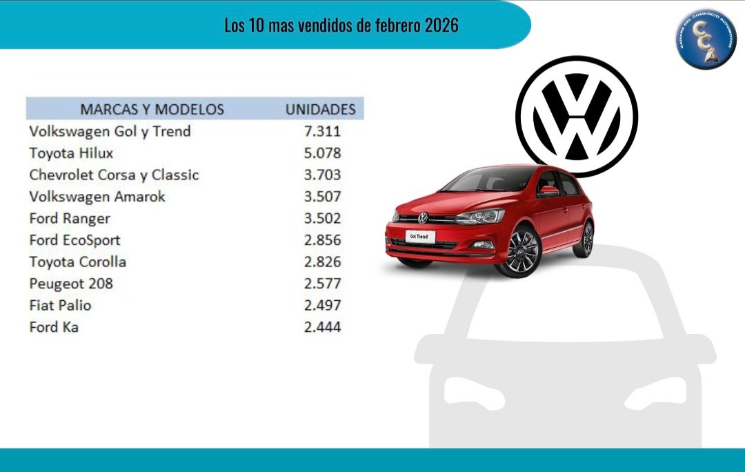 El ranking de los autos usados más vendidos en febrero estuvo encabezado por el VW Gol y Trend, con 7.311 unidades, seguido por la Toyota Hilux (5.078), Chevrolet Corsa y Classic (3.703), VW Amarok (3.507), Ford Ranger (3.502), Ford EcoSport (2.856), Toyota Corolla (2.826), Peugeot 208 (2.577), Fiat Palio (2.497) y Ford Ka (2.444).