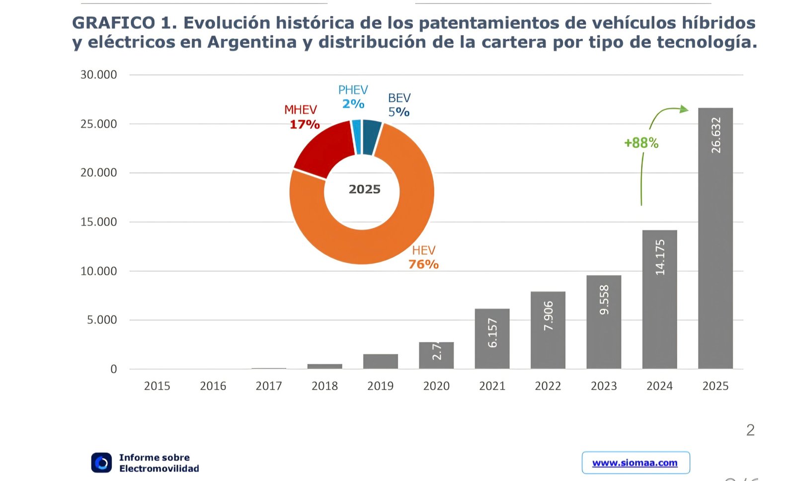 Durante 2025 se patentaron en Argentina 26.632 automóviles y comerciales livianos con algún tipo de motorización híbrida o eléctrica, lo que implicó un aumento de 88% respecto de 2024 y representó el 4,6% del total de ventas del mercado, según datos del SIOMAA.