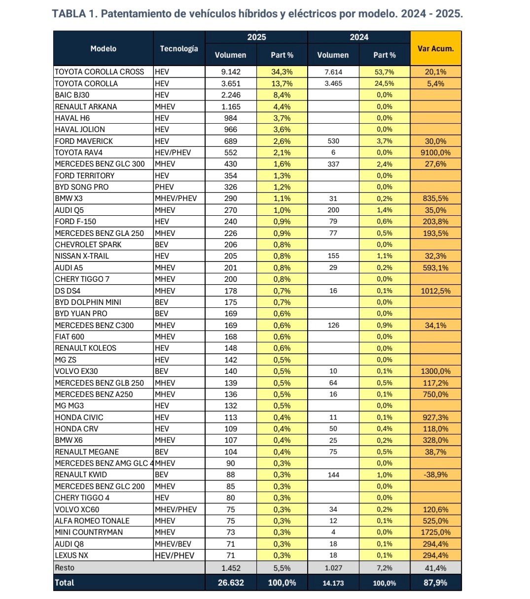 En términos tecnológicos, los híbridos no enchufables (HEV) continúan siendo la opción predominante, concentrando el 76% del segmento. Sin embargo, en el último año perdieron participación relativa frente a los Mild Hybrid (MHEV), que mostraron un fuerte crecimiento en 2025 (+250%). A su vez, la incorporación de modelos con nuevas tecnologías por parte de marcas con producción local y la llegada de nuevos jugadores al mercado están impulsando el desarrollo de segmentos hasta ahora poco explorados, como los híbridos enchufables (PHEV).
