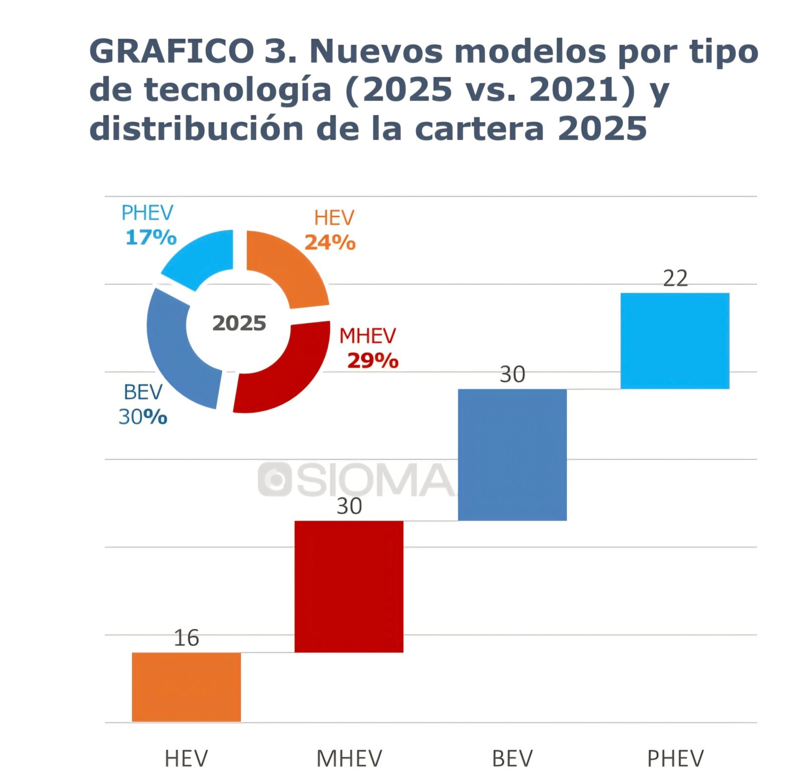 En 2021 la oferta estaba compuesta por 35 modelos, con una estructura concentrada en HEV (43%), una presencia relevante de MHEV (25,7%) y BEV (28,6%) y una participación todavía incipiente de PHEV (2,9%). Hacia 2025, con 133 modelos disponibles, la cartera aparece más equilibrada: 40 BEV, 39 MHEV, 31 HEV y 23 PHEV, lo que implica la incorporación de 98 nuevos modelos entre 2021 y 2025 y una diversificación tecnológica más marcada dentro del segmento.