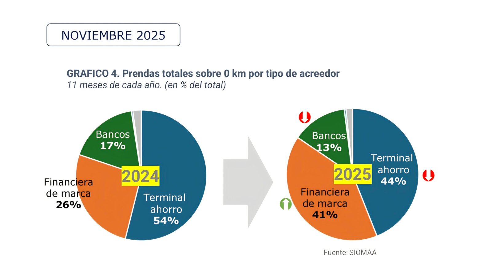 ● La dinámica en este segmento se alinea con la contracción general del crédito por la incertidumbre de fin de año. En la composición acumulada de acreedores sobre 0km, se observa una leve recuperación en la participación de la financiera de marca, que alcanzó el 41% del total de prendas en 2025 (vs. 26% en 2024). Por su parte, la porción del plan de ahorro continúa su descenso, cayendo al 44% (vs. 54% en 2024).