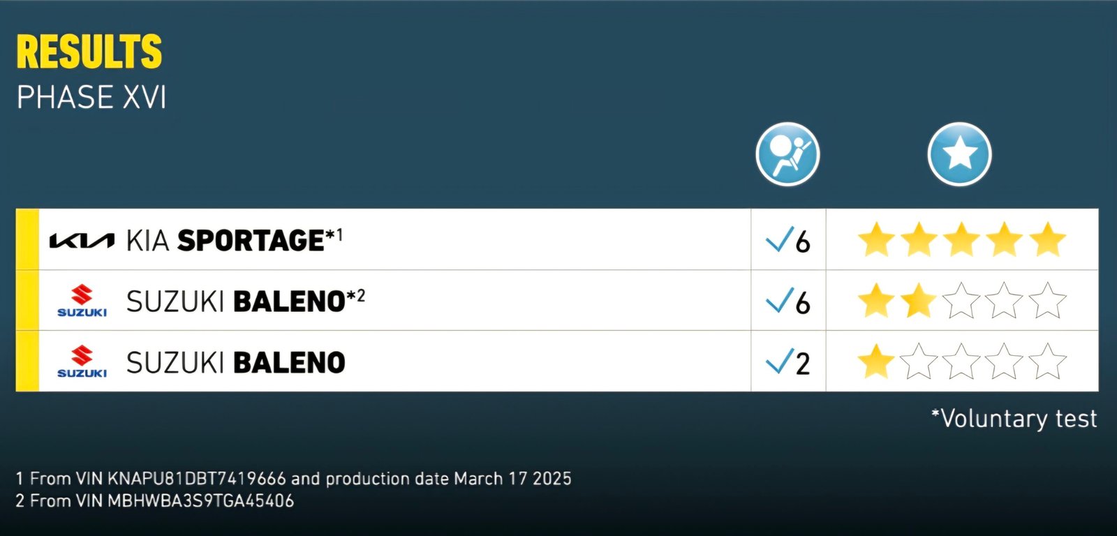 El Programa de Evaluación de Vehículos Nuevos para América Latina y el Caribe, Latin NCAP, publicó hoy la novena y última ronda de resultados del año 2025. Estos resultados muestran a Suzuki con una reacción tras la selección de la versión de dos bolsas de aire del Baleno, calificada con una estrella, y la estandarización de la versión de seis bolsas de aire, obteniendo dos estrellas. El renovado Kia Sportage obtuvo cinco estrellas. Estos son los últimos resultados antes de la actualización del protocolo de evaluación de Latin NCAP en 2026 donde se implementarán importantes mejoras de seguridad.