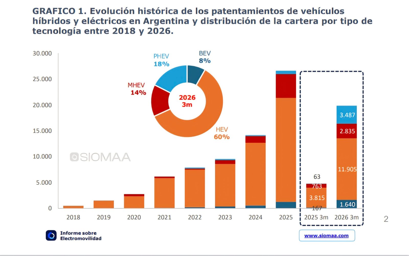 Durante el primer trimestre de 2026 se patentaron en Argentina 19.867 unidades con motorización híbrida o eléctrica. Este volumen cuadruplica lo patentado respecto al mismo período del año anterior. Sobre un volumen total de 157.000 unidades, estos vehículos ya representan el 13% del mercado.