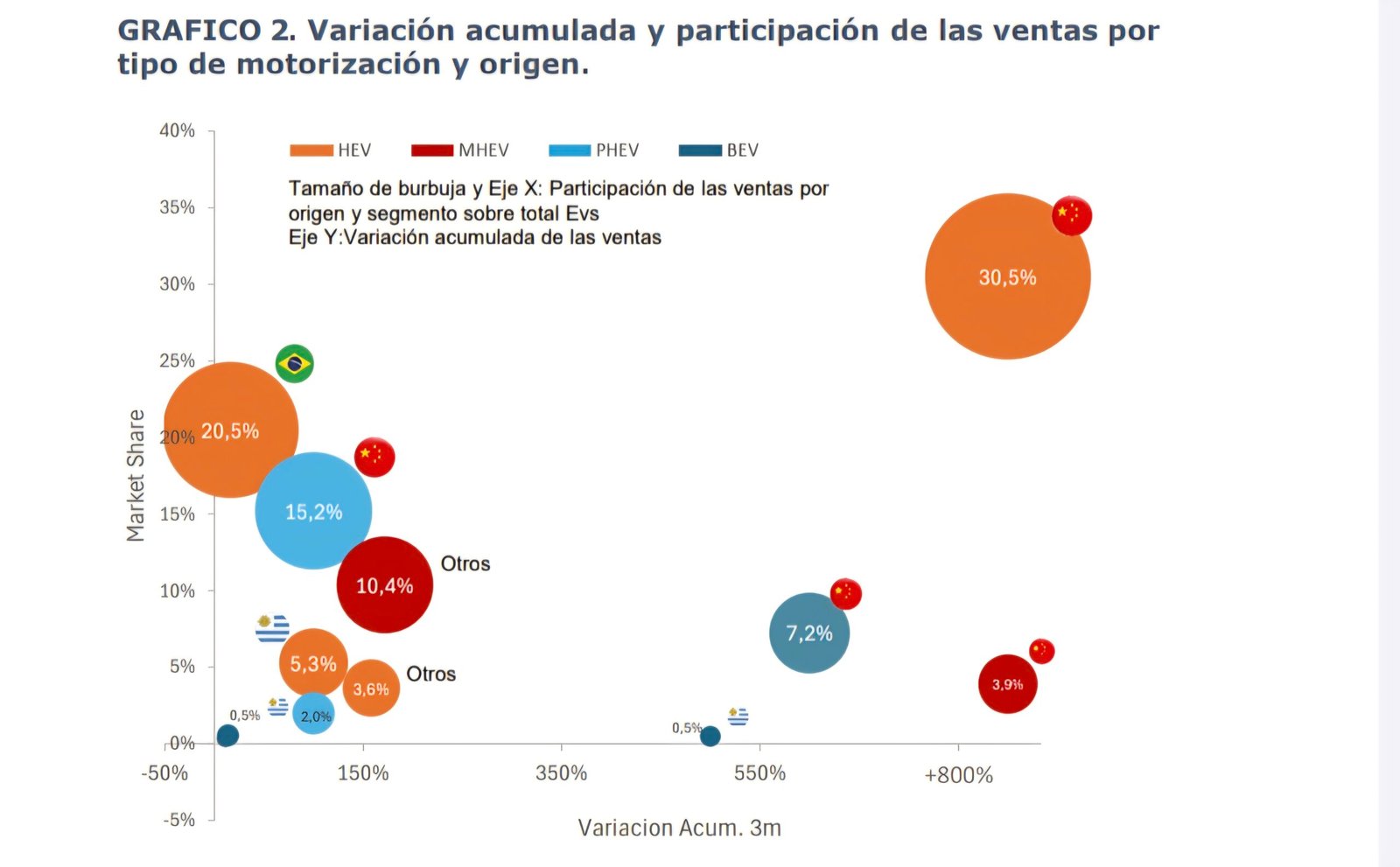 En el gráfico 2 se observa que el segmento HEV de origen chino es el que presenta mayor participación de mercado y mayor crecimiento interanual. Los vehículos híbridos brasileros, aún conservan una importante participación de mercado, pero con bajo crecimiento relativo.