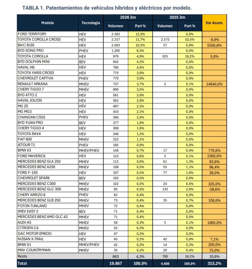 Durante el primer trimestre de 2026, el mercado de electromovilidad se caracterizó por una elevada concentración de ventas en pocos modelos en todos sus segmentos y mostrando una consolidación de marcas de origen chino como las dominantes en vehículos de propulsión alternativa. En el segmento de híbridos (HEV) —el de mayor volumen dentro de las motorizaciones electrificadas— se observa un cambio en la concentración de la oferta.