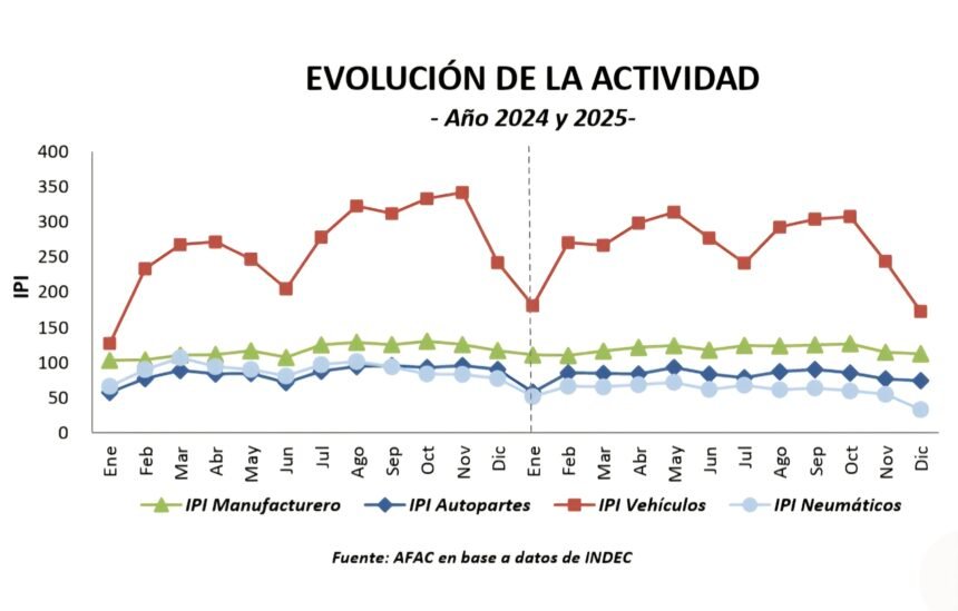 La producción de vehículos cayó 3,1% durante 2025, el segmento de neumáticos sufrió un fuerte descenso del 31,9% interanual y las exportaciones de autopartes retrocedieron 2,9% en el mismo período.