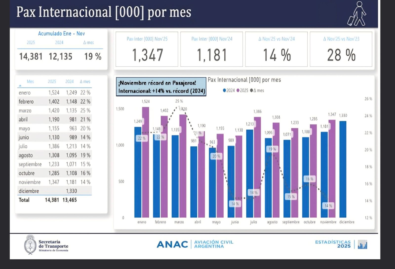 El récord del segmento internacional (usuarios de aeropuertos) se alcanzó con 1.347.497 pasajeros. Un 14% más que el récord previo de noviembre 2024 (1.181.375)