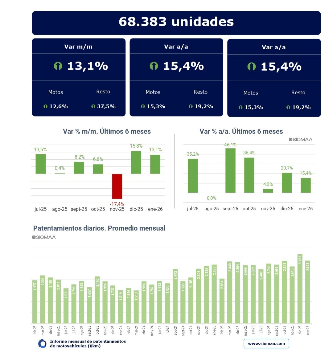 Durante el primer mes del año se patentaron 68.383 motovehículos, lo que representa una suba interanual del 15,4% respecto de enero de 2025.