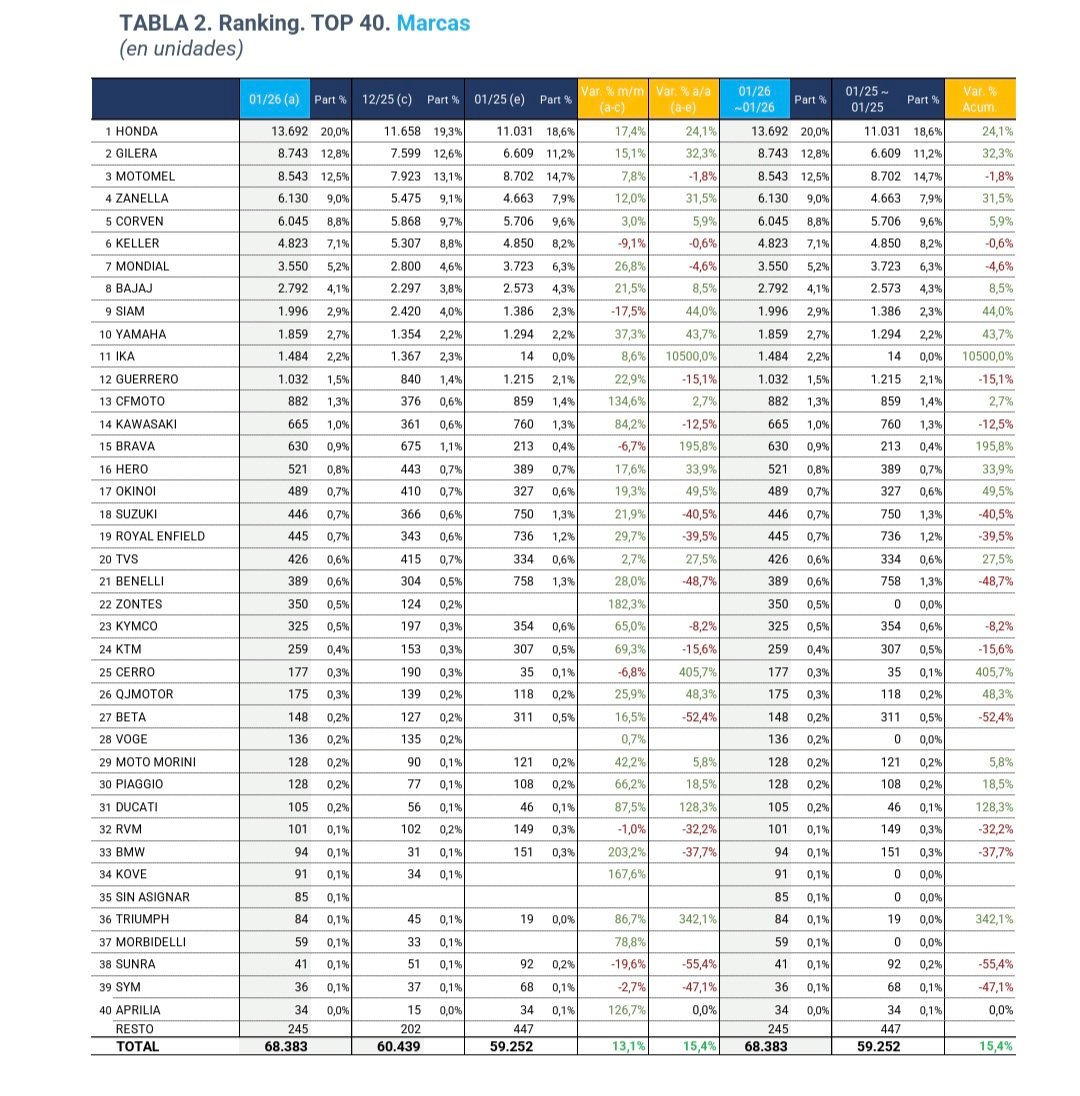 En el detalle por marcas, Honda volvió a encabezar el ranking con 13.692 unidades, seguida por Gilera (8.743) y Motomel (8.543). Zanella recuperó el cuarto lugar con 6.130 unidades, desplazando a Corven, que quedó quinta con 6.045, aunque continúa mostrando un desempeño en alza.