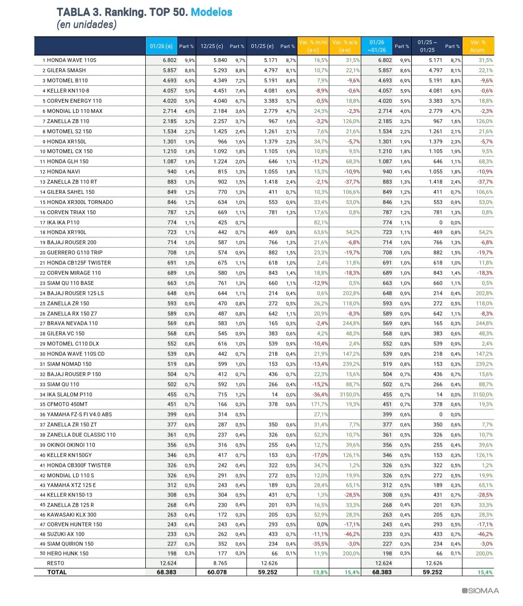 Entre los modelos, la Honda Wave 110 reafirmó su liderazgo con 6.802 unidades, seguida por la Gilera Smash (5.857). La novedad del mes fue el ascenso de la Motomel B110, que recuperó el tercer puesto con 4.693 patentamientos, superando a la Keller KN 110-8 (4.057). La Corven Energy 110 cerró el top cinco con 4.020 unidades.